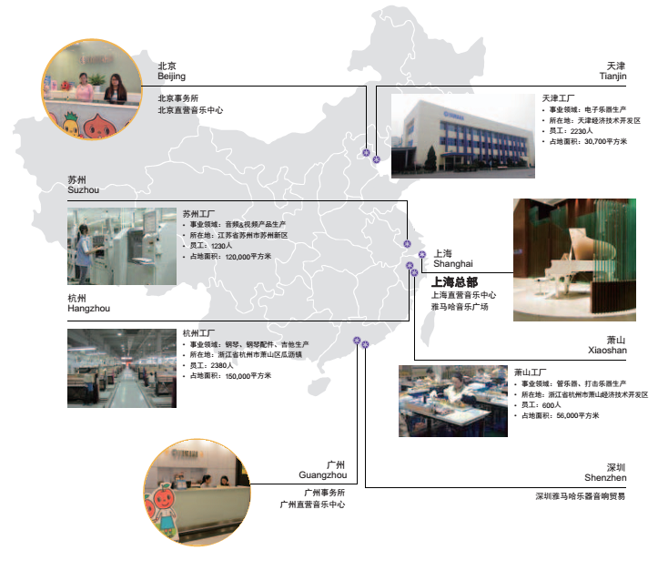 雅馬哈(中國(guó))總部坐落于上海新閘路云和大廈,辦公面積近5000平方米,共有員工200余人。總部同時(shí)還設(shè)立了雅馬哈在全國(guó)以音樂為主題的,集體驗(yàn)、教學(xué)、交流、服務(wù)為一體綜合性多功能音樂廣場(chǎng),為所有音樂愛好者提供了與世界樂器接觸的機(jī)會(huì)。除了上海,雅馬哈(中國(guó))在全國(guó)還有2個(gè)辦事機(jī)構(gòu),分別在北京和廣州。