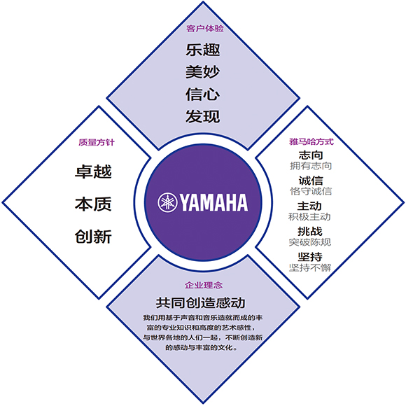 企業(yè)口號、企業(yè)理念和客戶體驗這三大要素闡述了雅馬哈集團存在背后的意義,同時明確了作為雅馬哈基礎的基本原則。為了讓雅馬哈實現(xiàn)這樣的理想,全體員工就必須貫徹落實雅馬哈方式和雅馬哈質(zhì)量,同時從中為日常工作尋找啟發(fā)與指導。