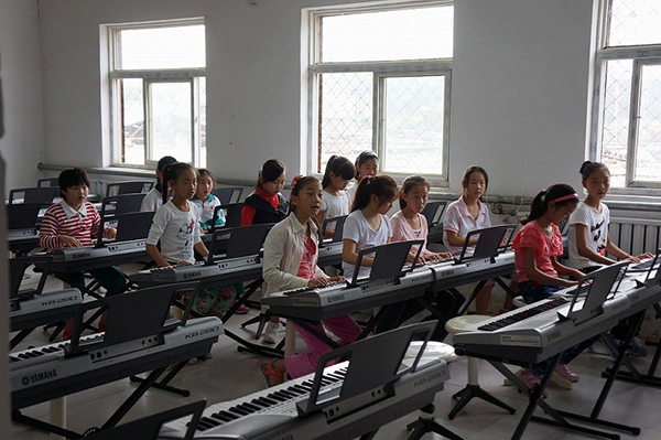 學(xué)生們?cè)趷?ài)心音樂(lè)教室試琴